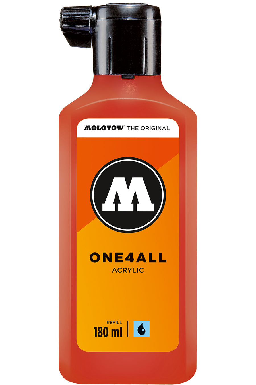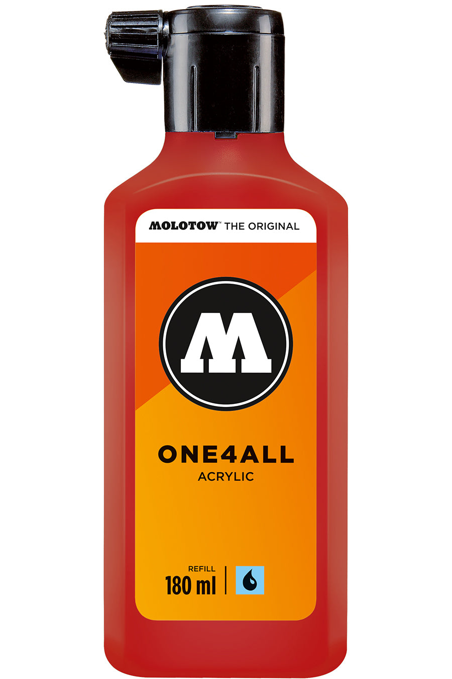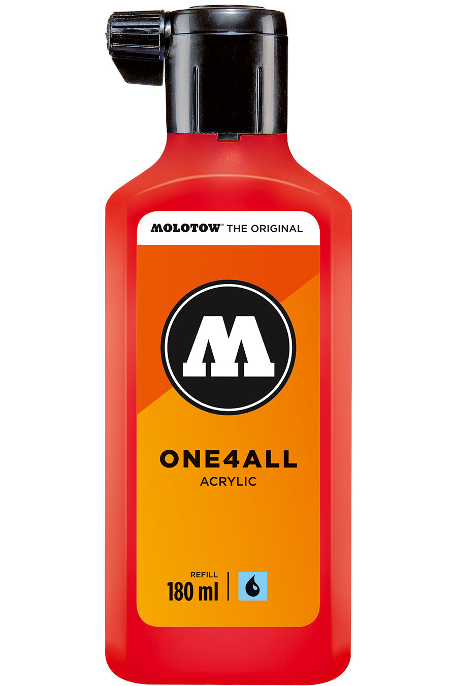 Molotow® ONE4ALL™ refills are an acrylic-based hybrid ink/paint. All colors are highly-opaque, permanent, have good UV resistance, and work on most surfaces indoors and out. For increased transparency, ONE4ALL ink may be diluted with water or acetone (1-3%). Ink may be used to refill markers, mixed to create unique colors, or used alone with a brush or palette knife application.