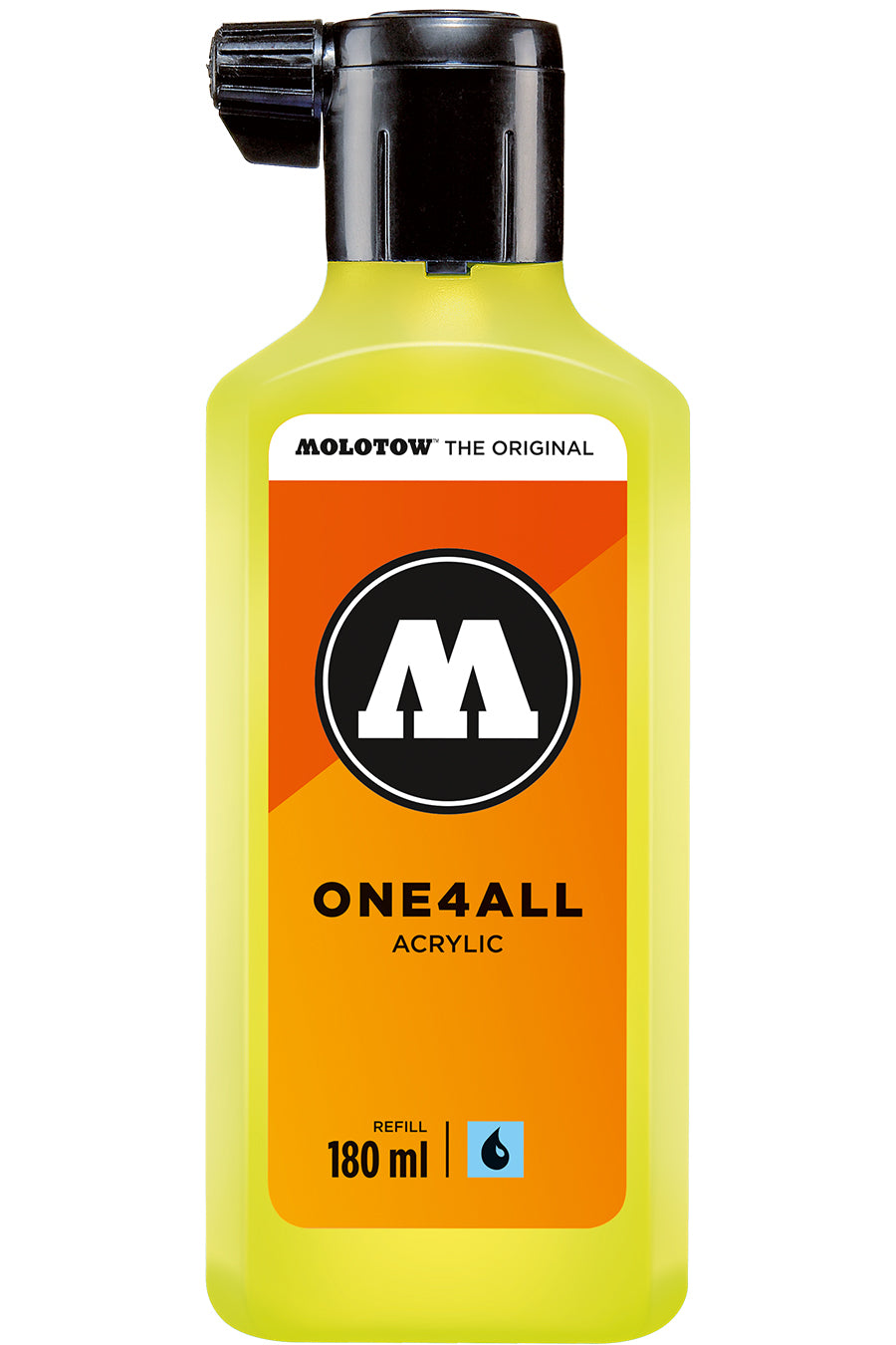 Molotow® ONE4ALL™ refills are an acrylic-based hybrid ink/paint. All colors are highly-opaque, permanent, have good UV resistance, and work on most surfaces indoors and out. For increased transparency, ONE4ALL ink may be diluted with water or acetone (1-3%). Ink may be used to refill markers, mixed to create unique colors, or used alone with a brush or palette knife application.