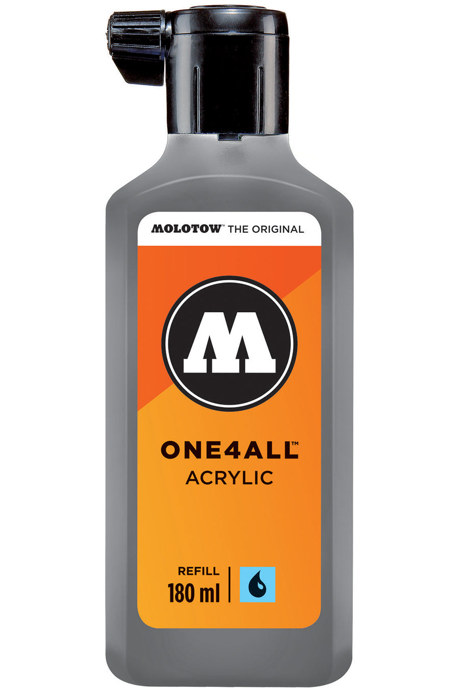 Molotow® ONE4ALL™ refills are an acrylic-based hybrid ink/paint. All colors are highly-opaque, permanent, have good UV resistance, and work on most surfaces indoors and out. For increased transparency, ONE4ALL ink may be diluted with water or acetone (1-3%). Ink may be used to refill markers, mixed to create unique colors, or used alone with a brush or palette knife application.