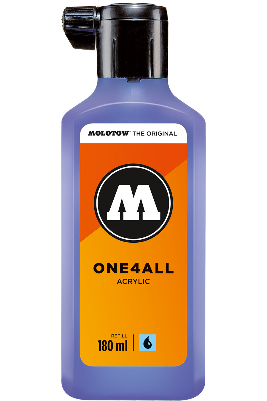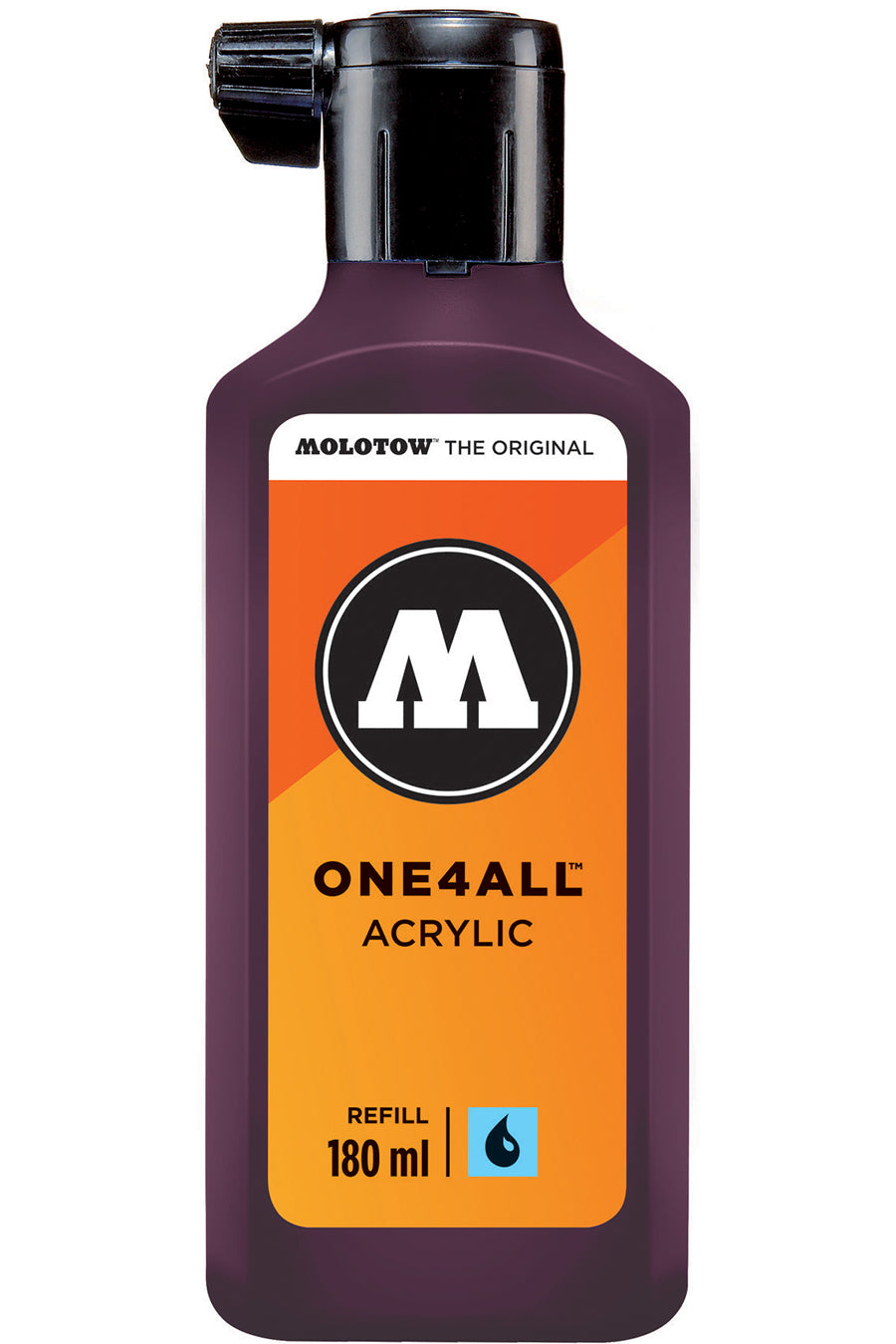 Molotow® ONE4ALL™ refills are an acrylic-based hybrid ink/paint. All colors are highly-opaque, permanent, have good UV resistance, and work on most surfaces indoors and out. For increased transparency, ONE4ALL ink may be diluted with water or acetone (1-3%). Ink may be used to refill markers, mixed to create unique colors, or used alone with a brush or palette knife application.