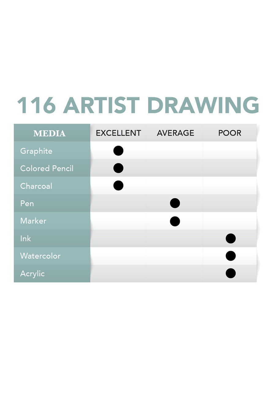 116 Artist Drawing, 24x36 Drawing Pad SKU - 116P243640 Size - 24x36 Creative Process: Stage 2. Fine Art Rendering. This paper is ideal for use with traditional drawing media such as graphite, colored pencil, and charcoal, and has excellent erasability. This sheet is also acid-free to ensure that paper won't discolor over time. Made in the USA.