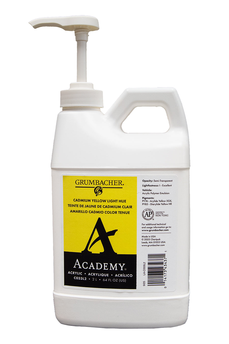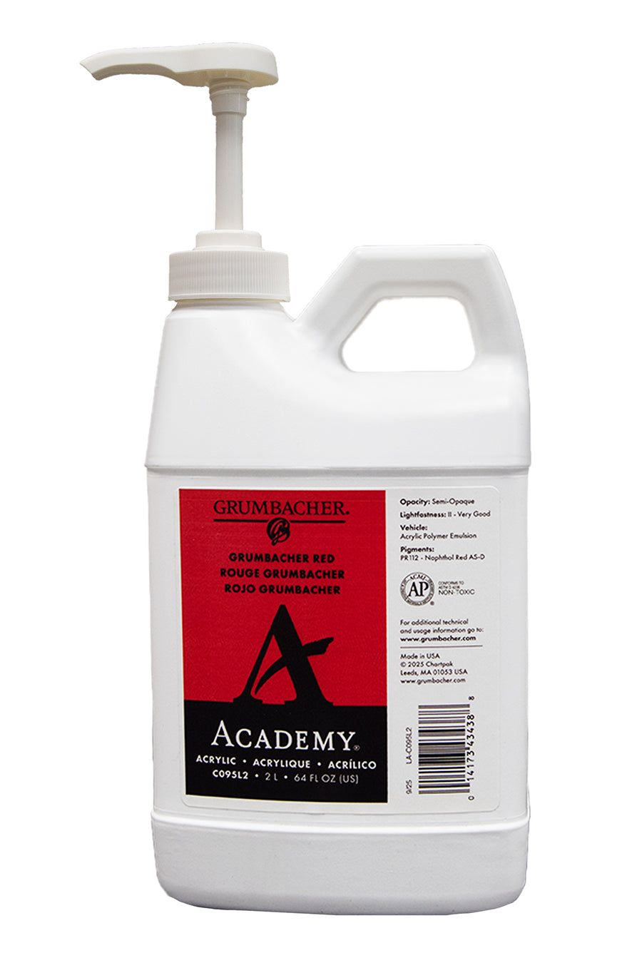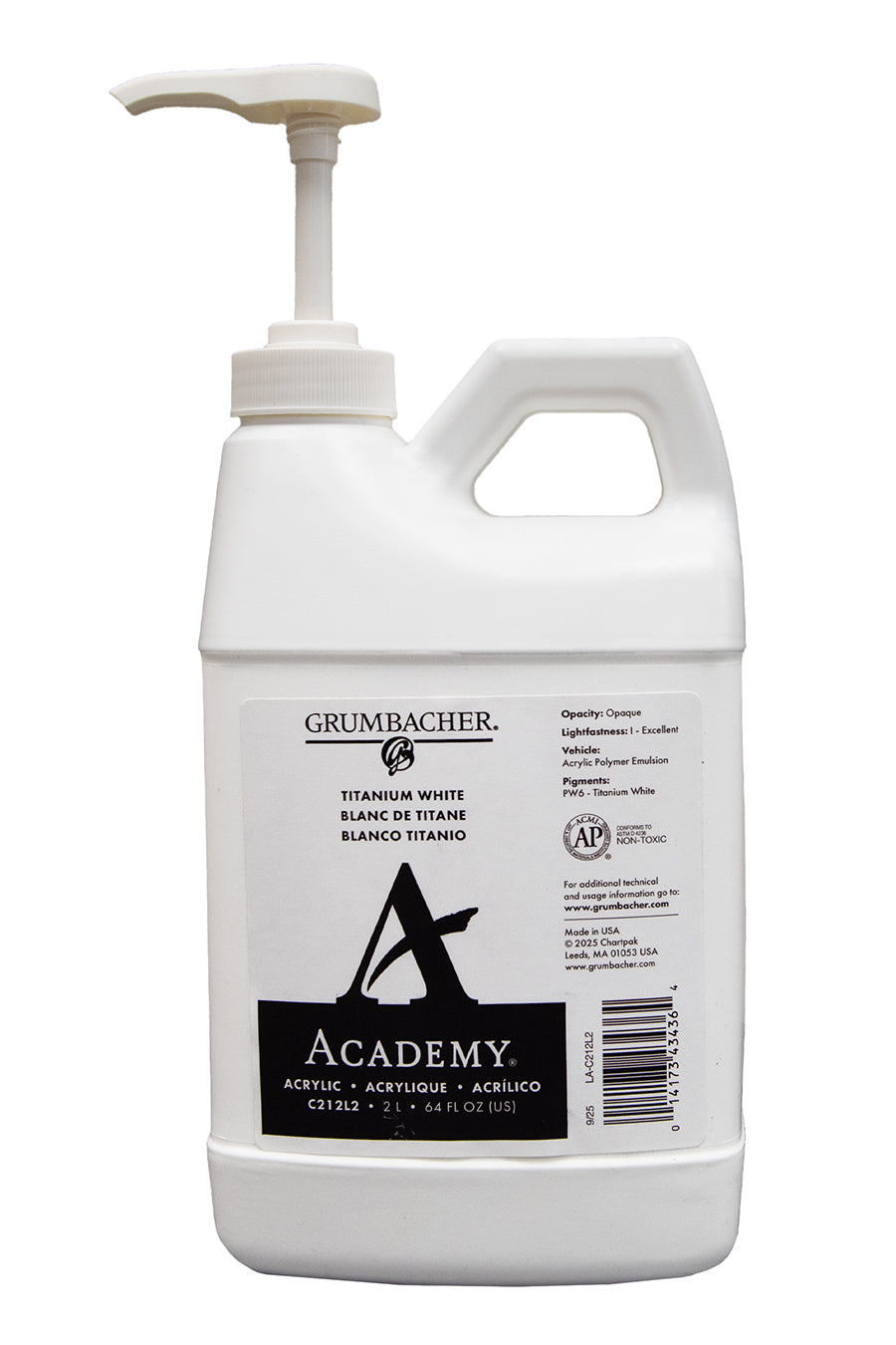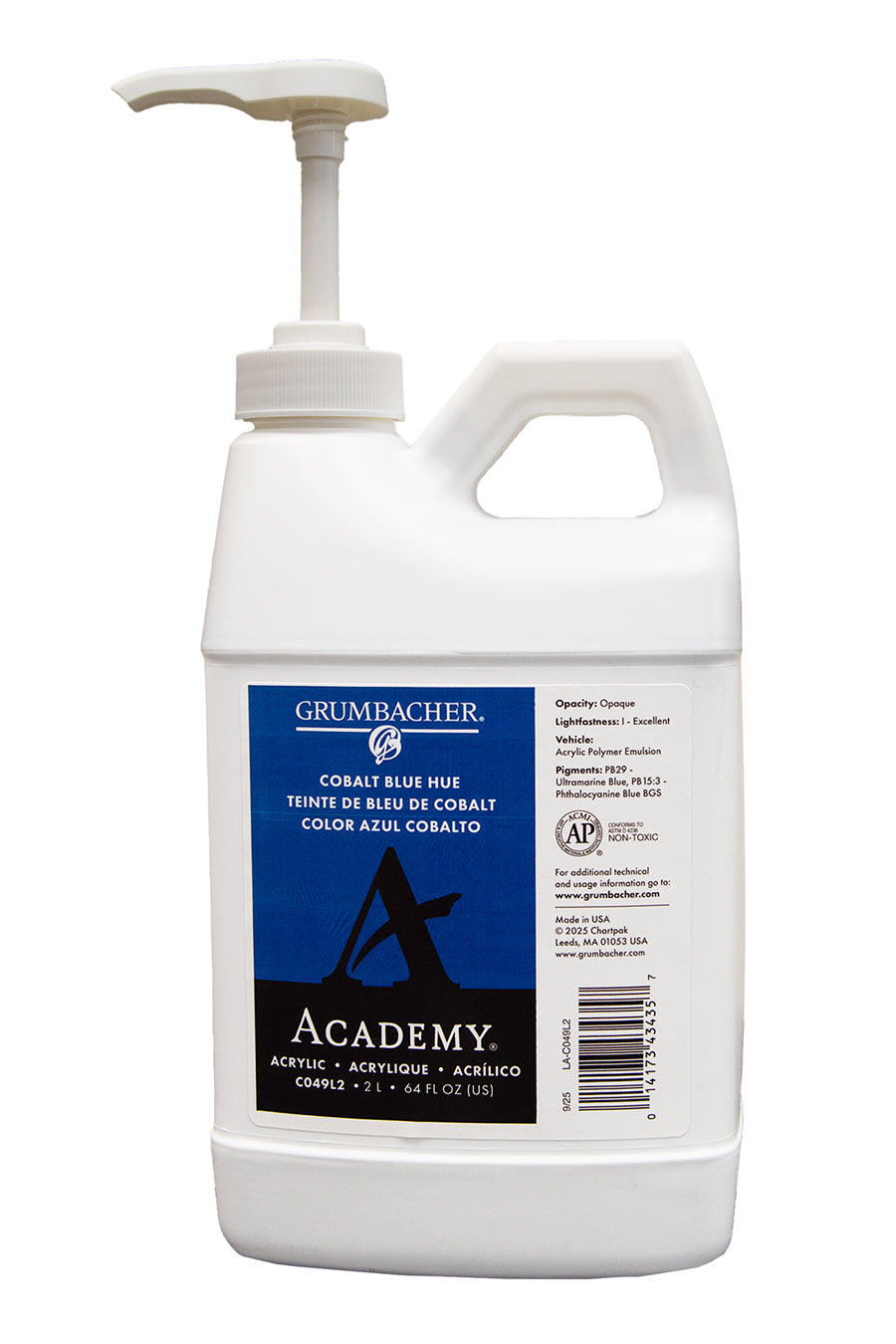 Grumbacher Academy Acrylics are classic medium-bodied artist acrylic paints known for their vibrant pigmentation, reliable performance, and excellent lightfastness. Developed to deliver artist quality at an accessible price for artists of all levels, these paints flow smoothly, mix cleanly, and dry to a flexible, durable film. Suitable for canvas, wood, paper, and mixed media surfaces. All colors are formulated with the best lightfast rating in their class, ensuring lasting color integrity. Now offered in convenient 2 liter pump containers, this bulk format is ideal for studio use, classrooms, workshops, and high-volume painting applications with a generous paint supply in an easy-to-use dispenser.