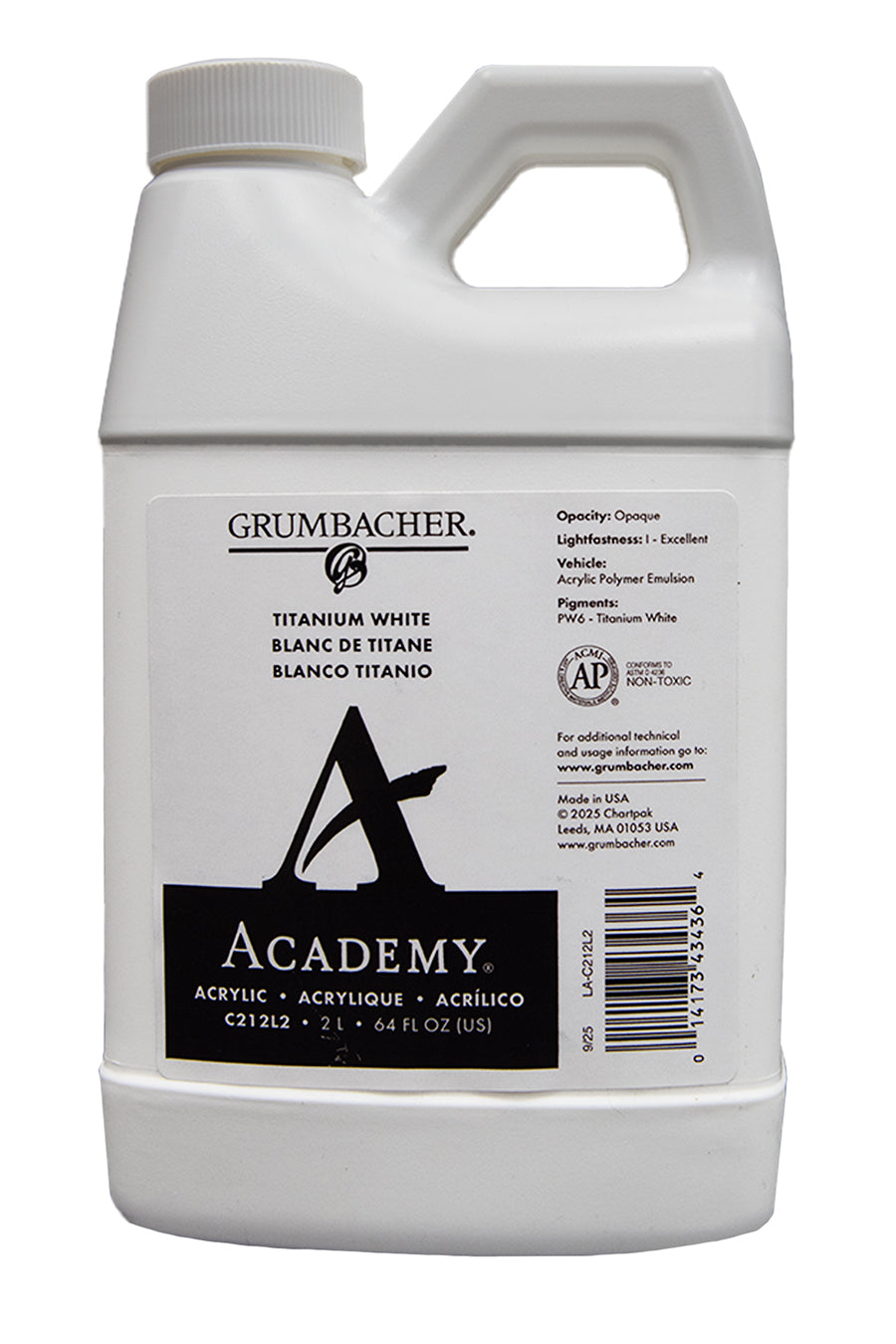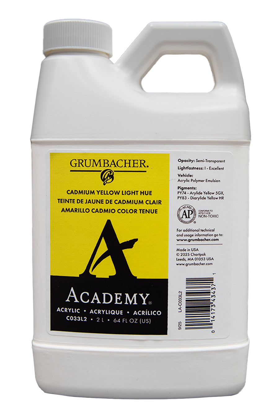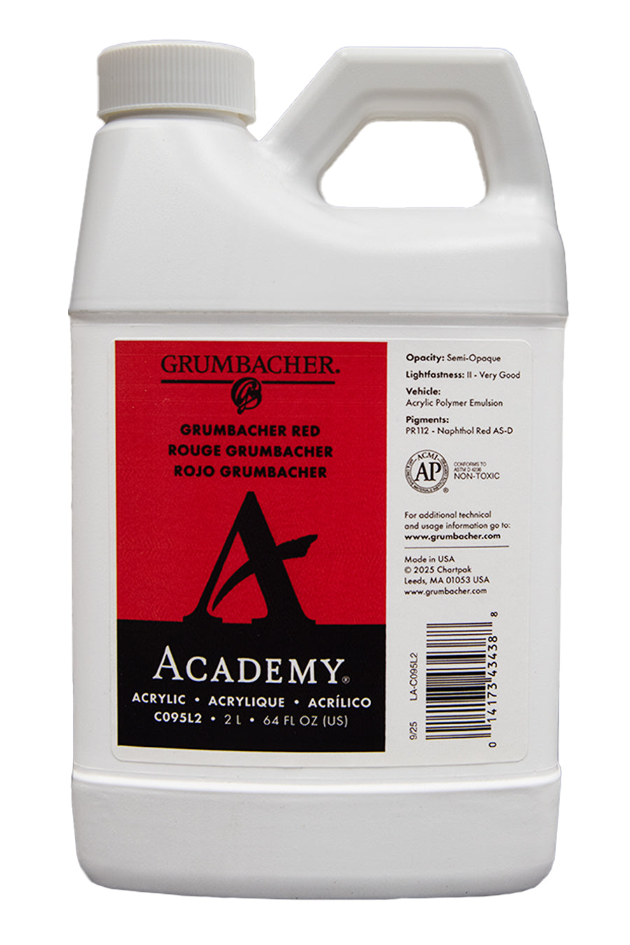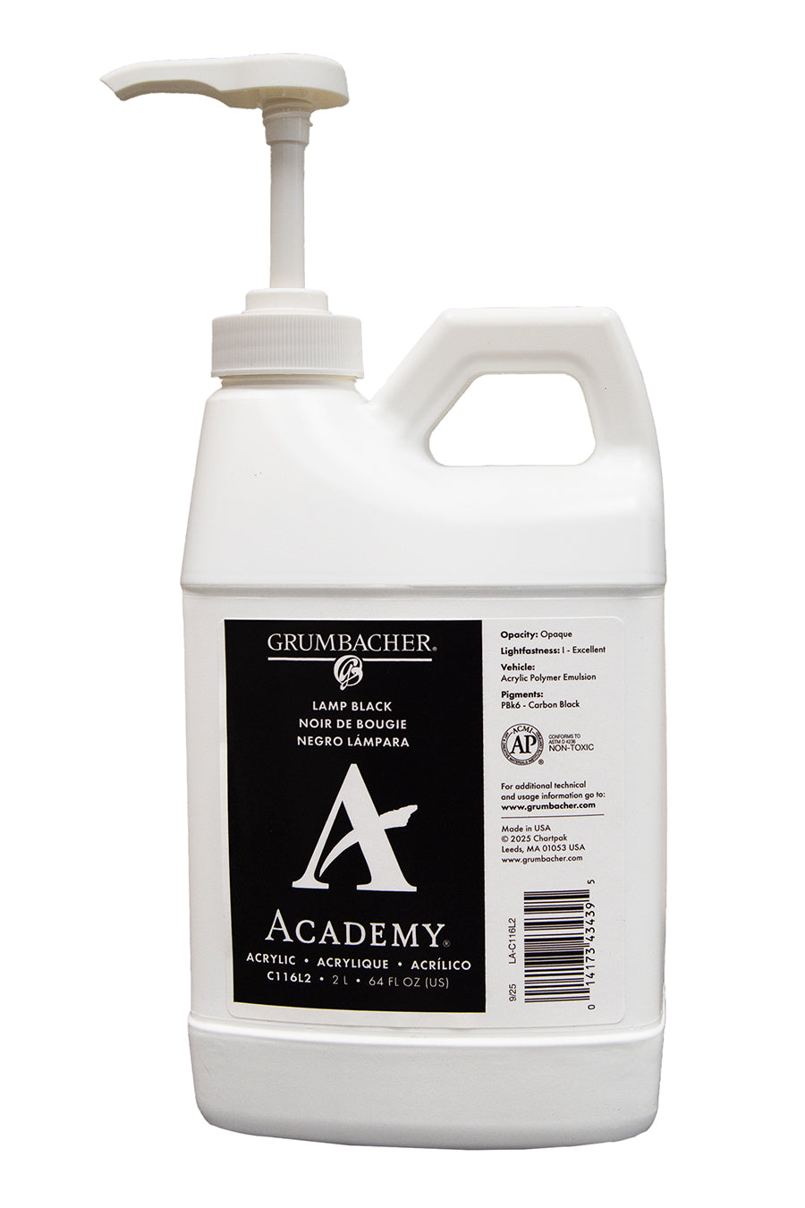 Grumbacher Academy Acrylics are classic medium-bodied artist acrylic paints known for their vibrant pigmentation, reliable performance, and excellent lightfastness. Developed to deliver artist quality at an accessible price for artists of all levels, these paints flow smoothly, mix cleanly, and dry to a flexible, durable film. Suitable for canvas, wood, paper, and mixed media surfaces. All colors are formulated with the best lightfast rating in their class, ensuring lasting color integrity. Now offered in convenient 2 liter pump containers, this bulk format is ideal for studio use, classrooms, workshops, and high-volume painting applications with a generous paint supply in an easy-to-use dispenser.