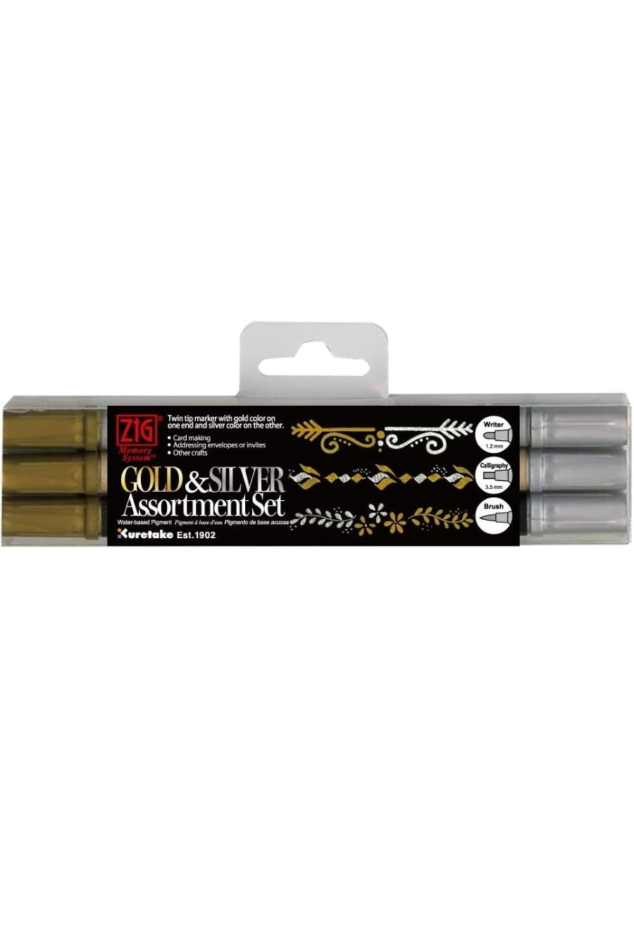Kuretake® Zig Gold and Silver Assorted Set, 3 Dual Tipped Pens
