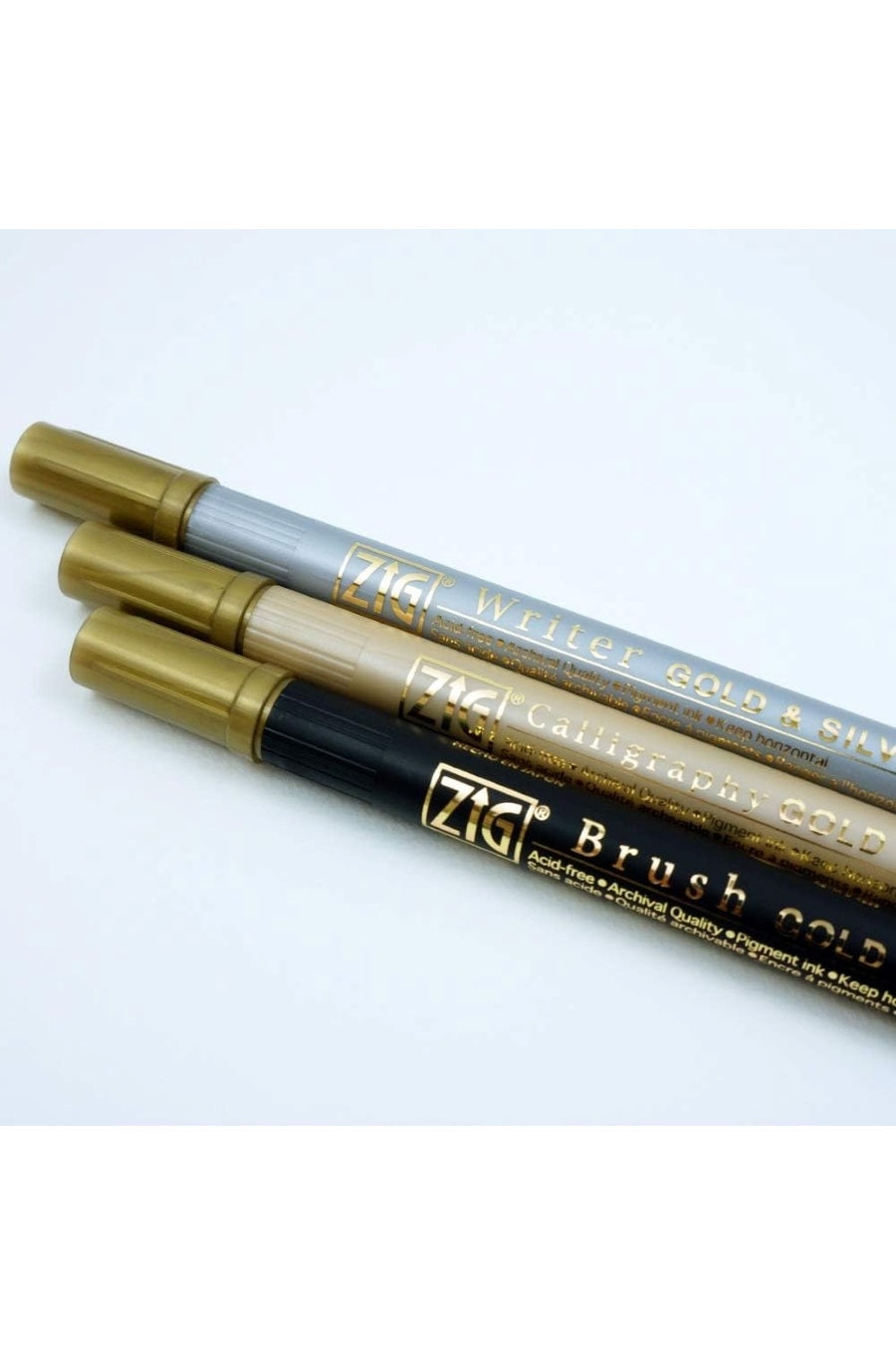 This set contains three pens with gold in one nib style on one side and its silver twin on the other. These water-based pigmented inks provide plenty of shine while being archival and lightfast.