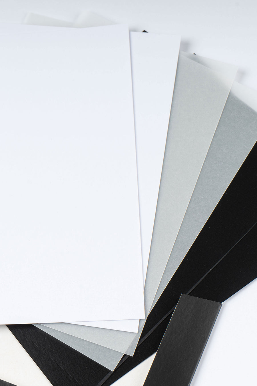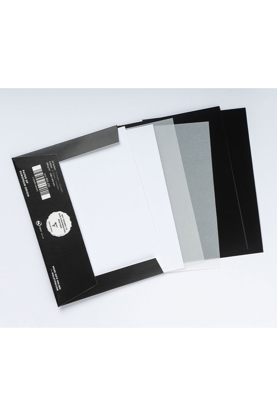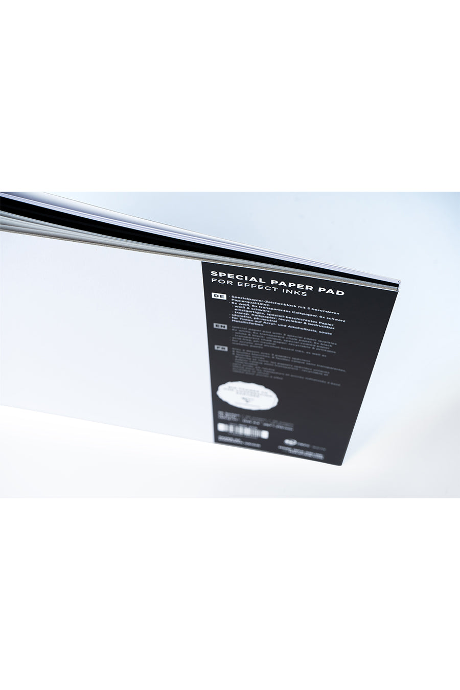This special paper was developed in collaboration with the French paper manufacturer Clairefontaine especially for alcohol and acrylic-based effect inks. The three special paper qualities consisting of 2x white special paper, 2x transparent chalk paper, and 2x black effect paper in A6 landscape format.