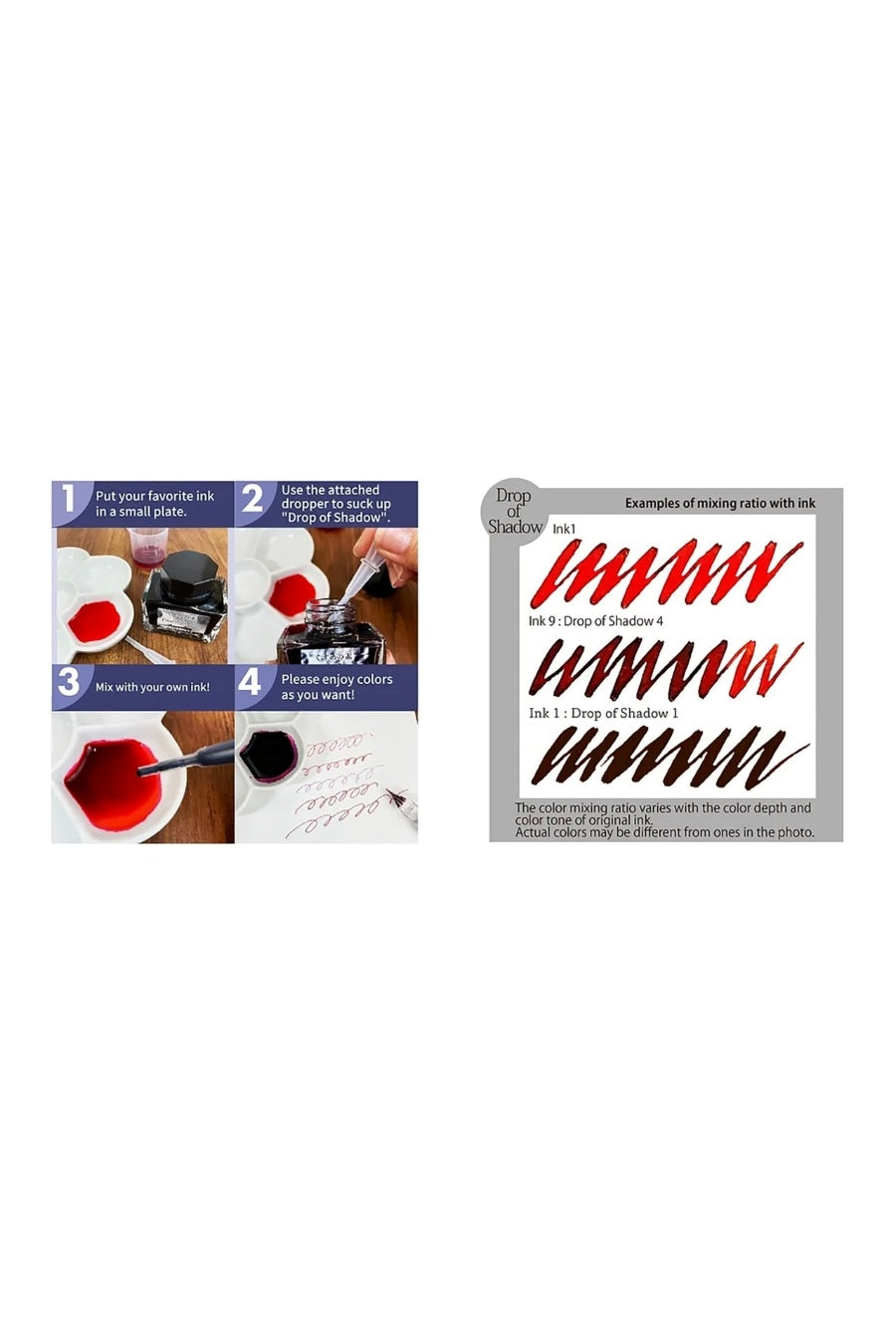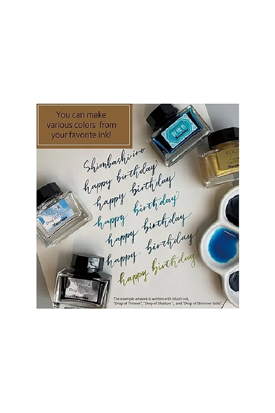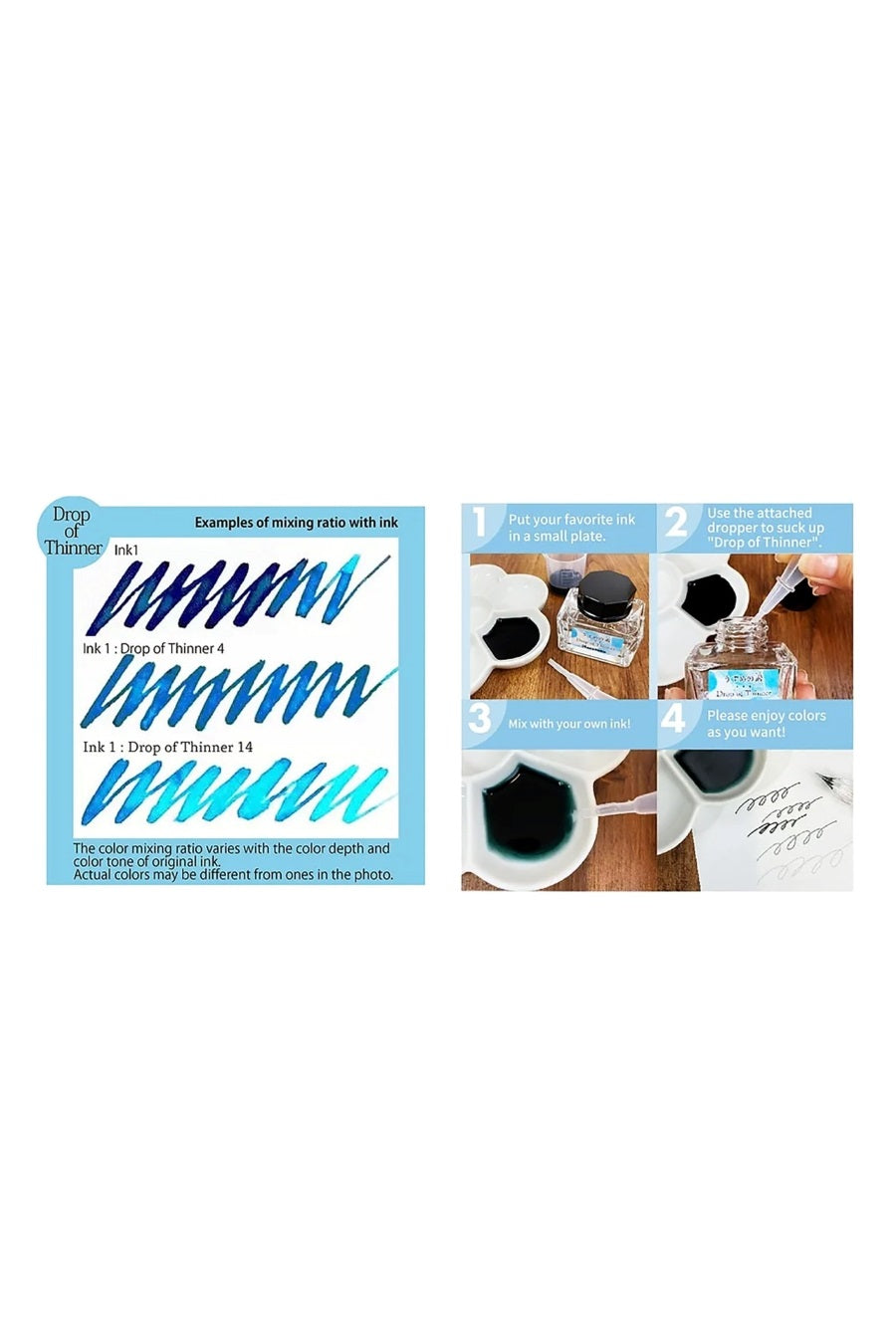 Drop of Thinner is compatible with the Ink Café system of DIY pens, brush pens, dip and glass pens, and fountain pens. It can be mixed with the Art Nouveau Inks, Drop of Shimmer Inks, and Meiji No Iro Inks.