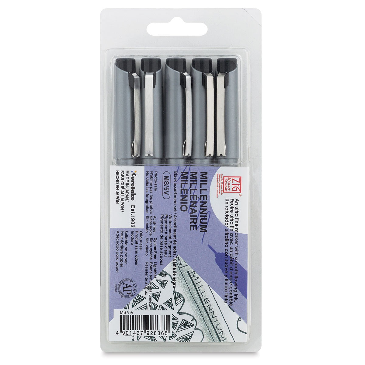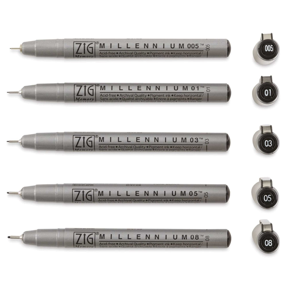 The Zig Millennium 5-Pen Set offers artists and crafters a versatile selection of high-quality fineliner pens, each providing a different line width to suit various creative needs. Each pen is filled with deep black pigmented ink that is acid-free, xylene-free, lightfast, waterproof, non-bleeding, and odorless. These features make the Zig Millennium pens ideal for a wide range of applications, including hand lettering, card making, journaling, and fine line sketching and drawing.